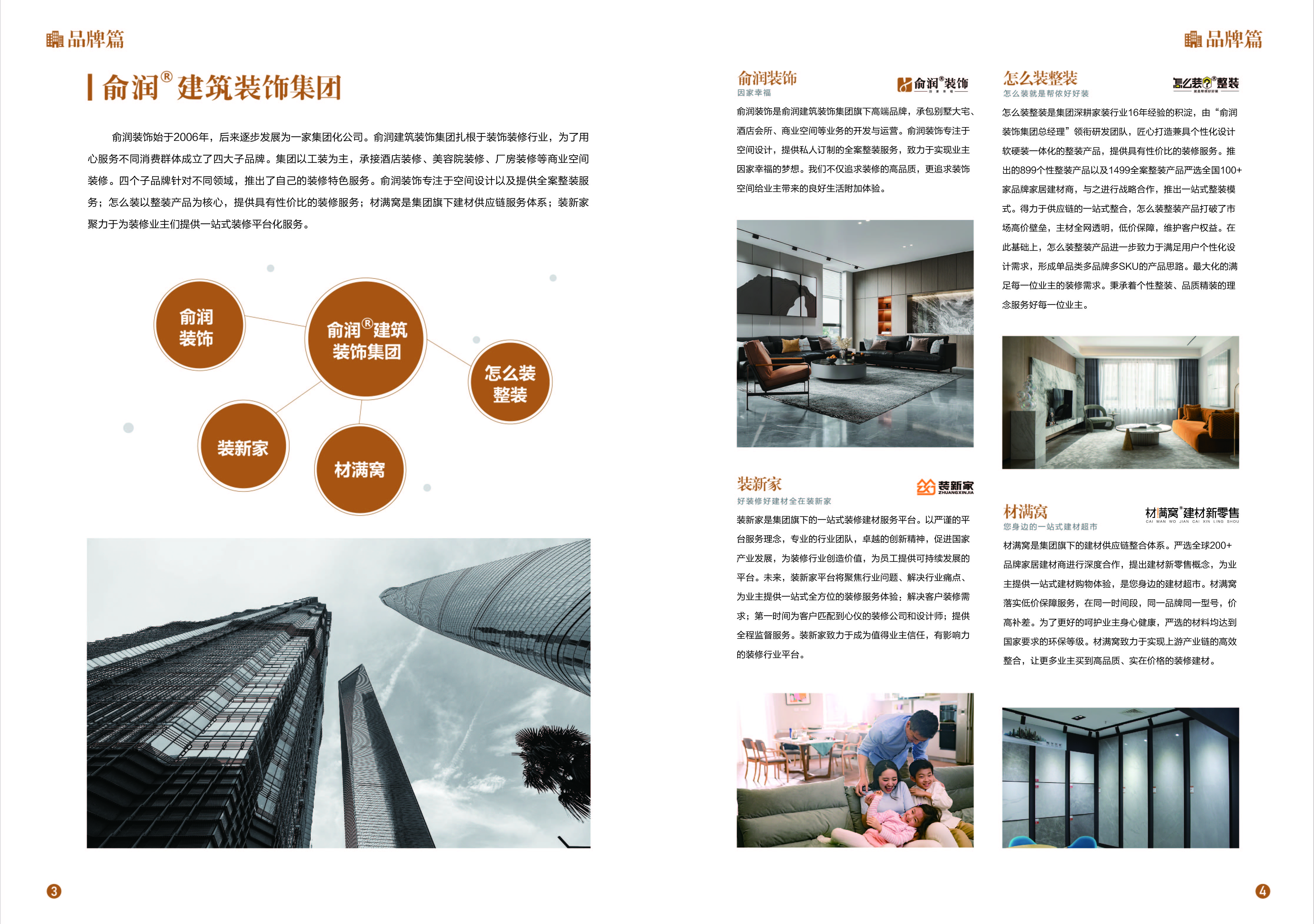 俞润装饰始于2006年,后来逐步发展为一家集团化公司。俞润建筑装饰集团扎根于装饰装修行业,为了用心服务不同消费群体成立了四大子品牌。集团以工装为主,承接酒店装修、美容院装修、厂房装修等商业空间装修。四个子品牌针对不同领域,推出了自己的装修特色服务。俞润装饰专注于空间设计以及提供全案整装服务;怎么装以整装产品为核心,提供具有性价比的装修服务;材满窝是集团旗下建材供应链服务体系;装新家聚力于为装修业主们提供一站式装修平台化服务。